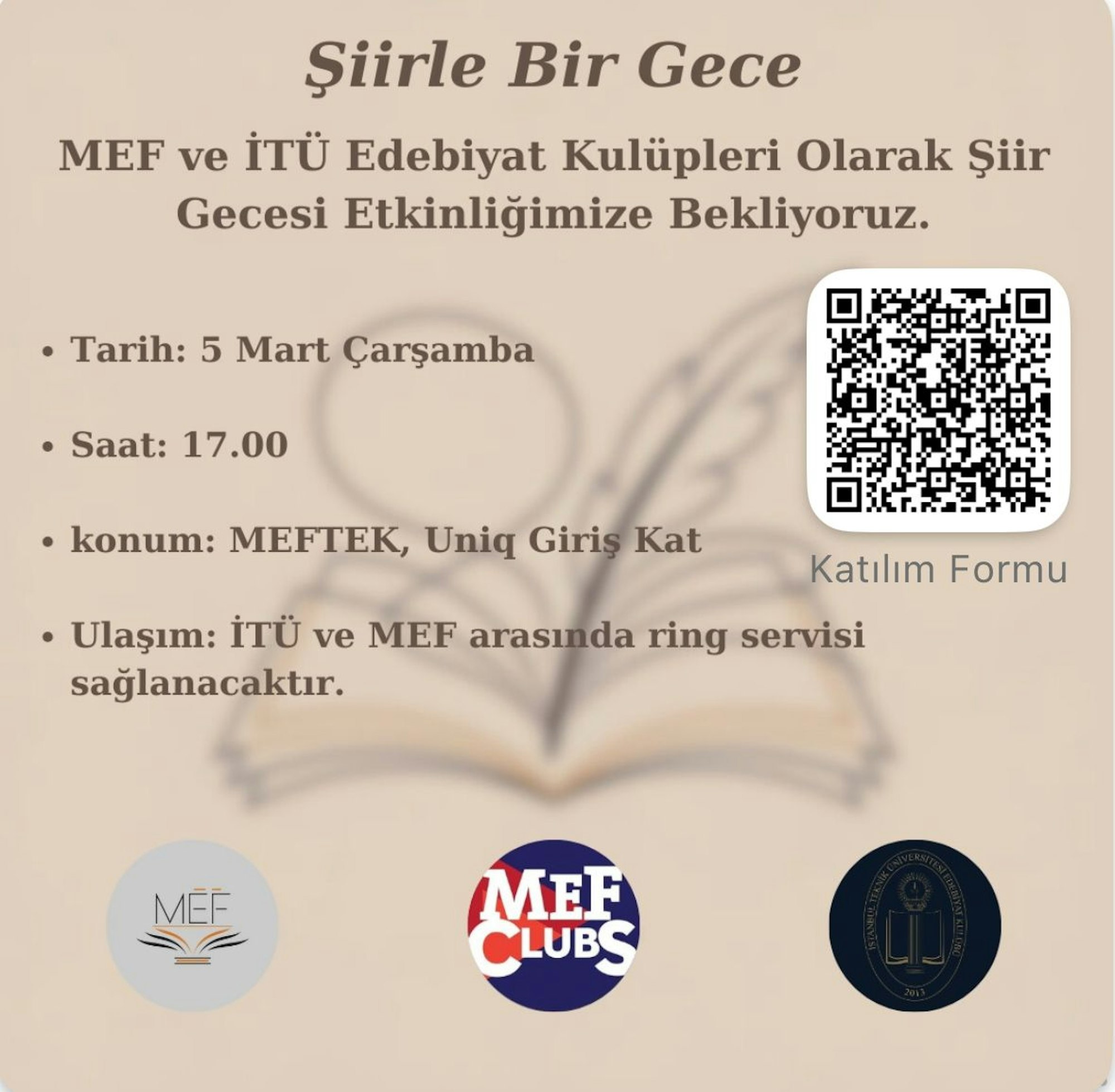 MEF Üniversitesi Edebiyat ve Kültür Kulübü ile İTÜ Edebiyat Kulübü’nün ortak düzenlediği "Şiirle Bir Gece" etkinliği, edebiyat tutkunlarını şiirin büyüleyici atmosferinde bir araya getirmeyi amaçlamaktadır. Katılımcılar, kendi yazdıkları veya sevdikleri şiirleri paylaşarak edebi bir sohbet ortamı oluşturacak, şiirin duygu ve düşünce dünyamızdaki yerini keşfedecektir. Etkinlik, şiir aracılığıyla sanatın birleştirici gücünü hissettirmeyi ve edebiyatseverler arasında bir bağ kurmayı hedeflemektedir.