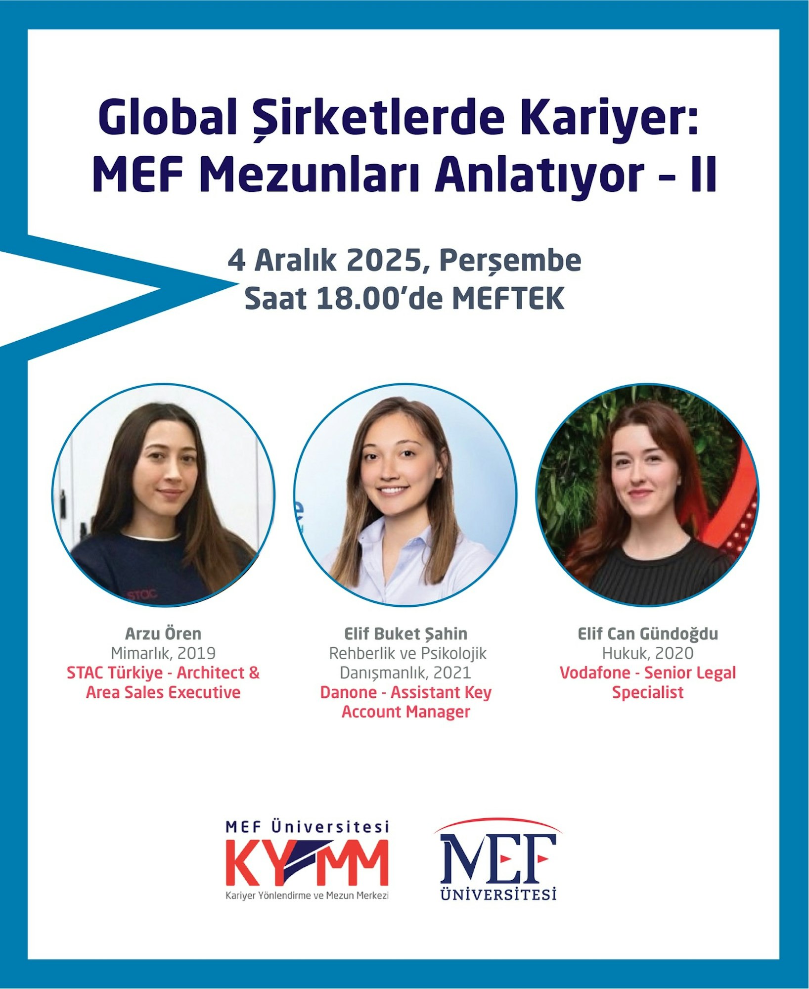 MEF Üniversitesi Kariyer Yönlendirme ve Mezun Merkezi organizasyonuyla düzenlenen bu buluşmada, MEF mezunlarımız global şirketlerdeki kariyer yolculuklarını paylaşacak.